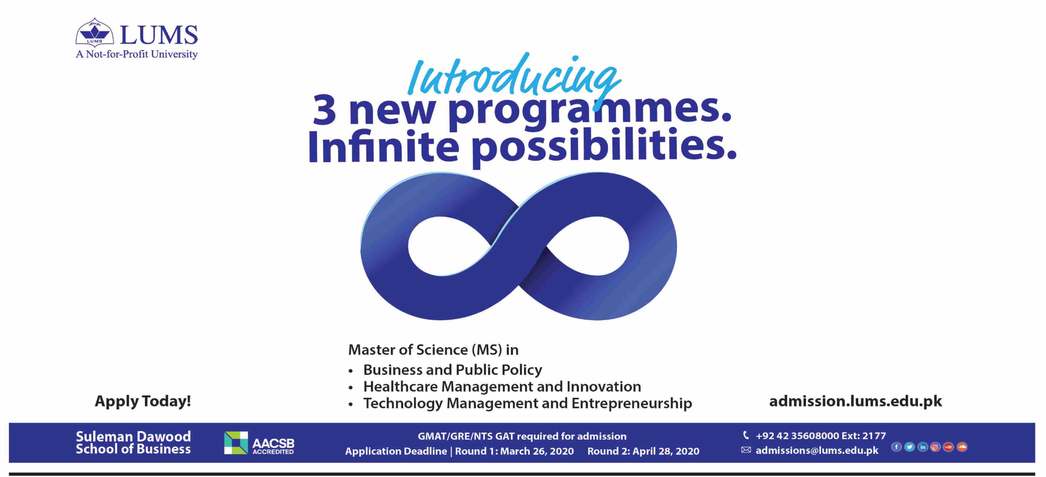 LUMS announced the Admission for the session of 2020. The LUMS has now starts the Admission in the Master of Science MS in Business and Public Policy, Healthcare management and innovation, Technology management and Entrepreneurship.The last date of submission of form is 26th March, 2020.