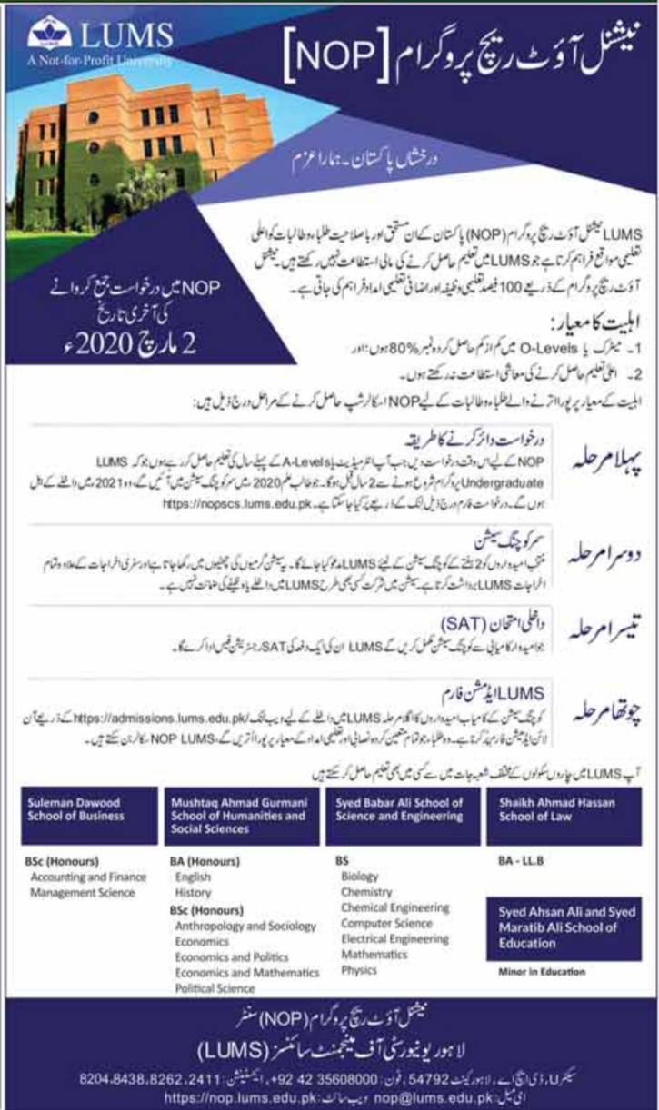 LUMS announced the Admission for the session of 2020. The LUMS has now starts the Admission in the National Out Reach Program.The last date of submission of form is 2nd Mrach, 2020.
