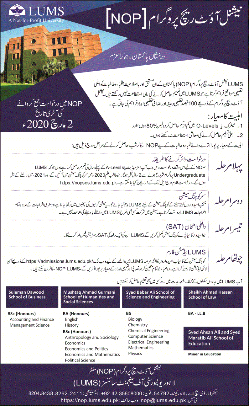 Lahore University of Management Sciences has announced admissions for National Outreach Program NOP. Last date for submission of admission applications is 02 March 2020.