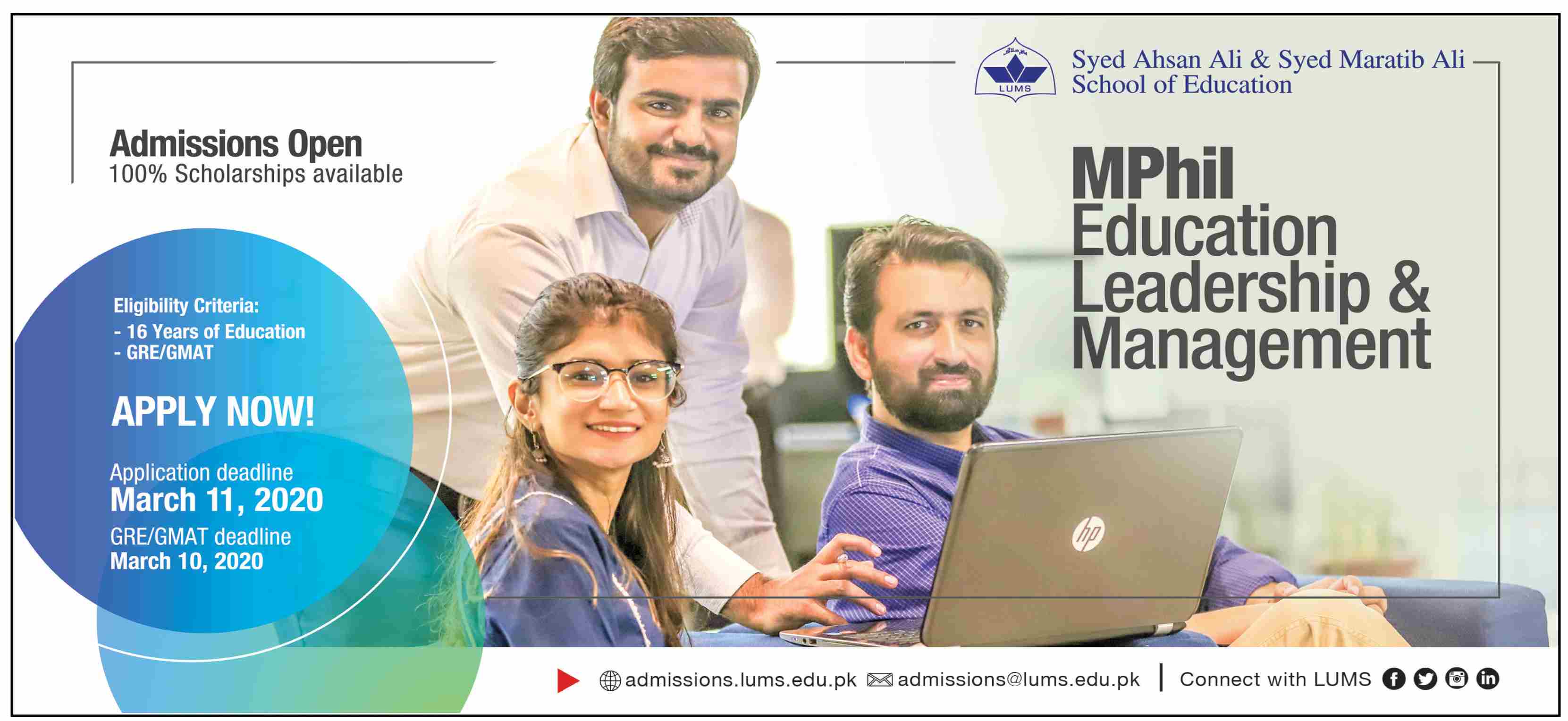 Lahore University of Management Sciences has announced admissions for M.Phil Educations. Admissions are open. Scholarships are available. Application deadline is 11 March 2020. Entry test deadline is 10 March 2020.