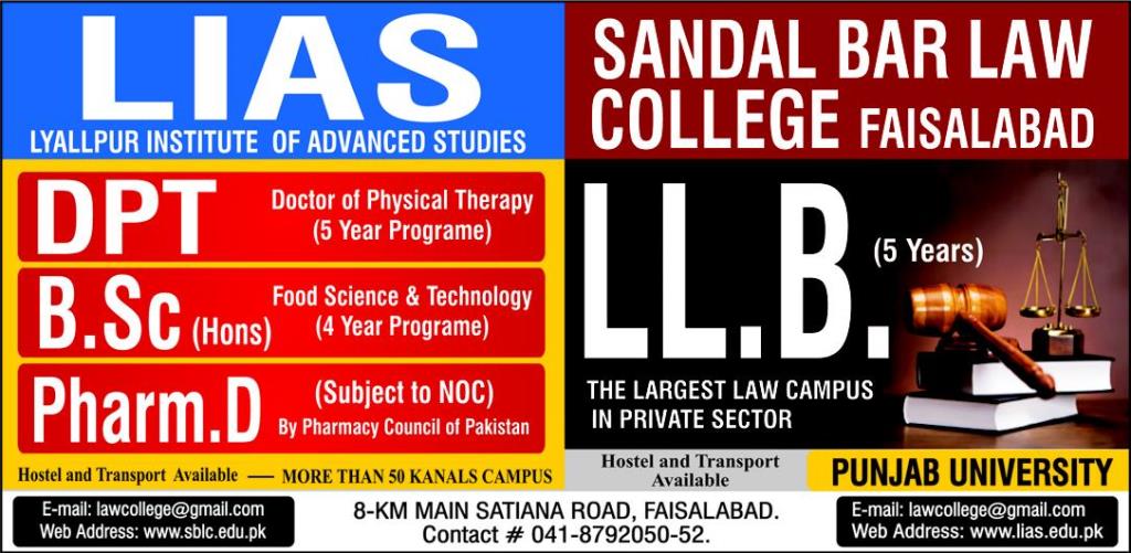 LIAS Lyallpur Institute of Advanced Studies has offering the admissions in Doctor of physical therapy, BSc Hons, Pharam.D in Faisalabad.