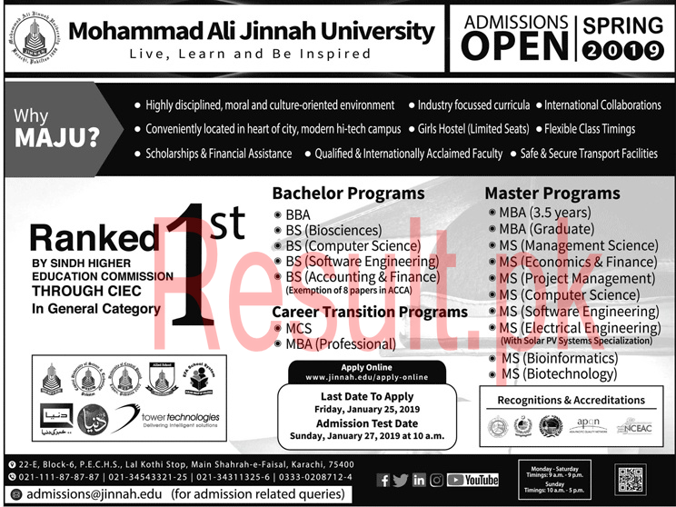 Karachi, Muhammad Ali Jinnah University Karachi announced the MAJU spring semester admissions 2019 in the graduate and postgraduate classes. MAJU admission spring semester 2019 is offered to the students and they are asked to forward their admission forms till the closing date of 25-1-2019. MAJU spring admissions 2019 entry test will be held on 27-1-2019. The students will have to deposit the fee after their selection in the entry test and they will also start their classes regularly.