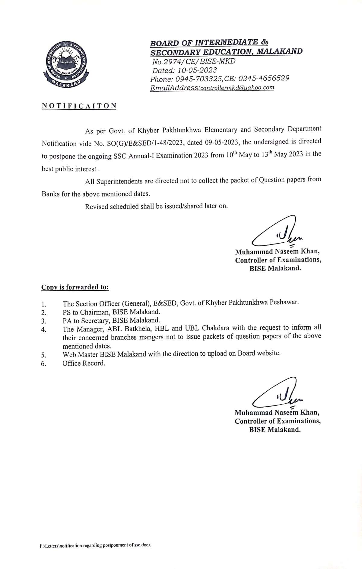 Malakand, Board of Intermediate and Secondary Education Malakand has already started their BISE Malakand matric part 1 annual exams 2023. The exams section of Malakand Board has cancelled their papers from 10th May to 13th May 2023 in the best public interest. Due to public unrest in the country, the board has announced the postponement of the Malakand Board SSC Part 1 annual exams 2023. The candidates can get the latest updates that Malakand Board 9th Class Annual Exams 2023 Postpones. When the situation will be normalized, the exams will be rescheduled and it will be informed to the students.