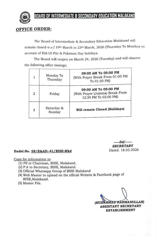Whether you are a student waiting for SSC exam updates or a parent planning a trip, this official holiday announcement provides the clarity needed. The board will resume its normal operations on Tuesday, March 24. Be sure to follow the Malakand Board official news for any changes in the 2026 academic calendar or upcoming BISE Malakad Matric Results schedules. Stay safe and enjoy your public holidays in Pakistan!