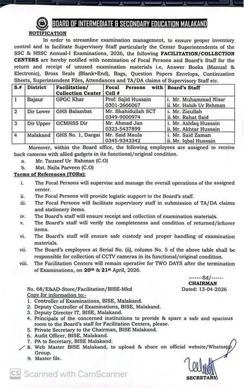 The education BISE Malakand Board has announced the appointment of the facilitation centers for the exams staff in different districts, which are shared as under: