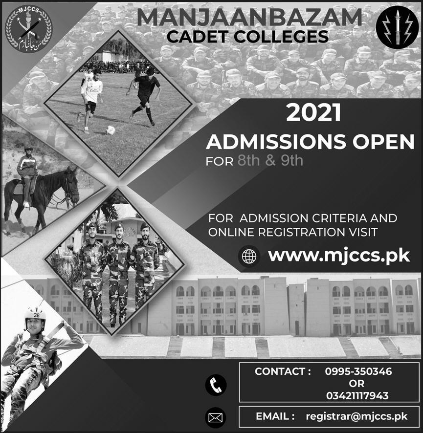 Manjannbazam Cadet College invites the application form for admissions of 8th and 9th class. For admission criteria and online registration visit www.mjccs.pk. Admission are open now You can get admissions by online registration service.
