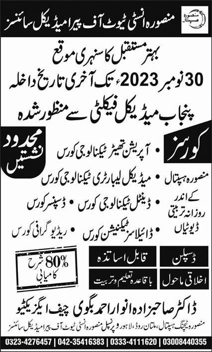 Mansoorah Institute of Paramedical Sciences Admissions Open 2023