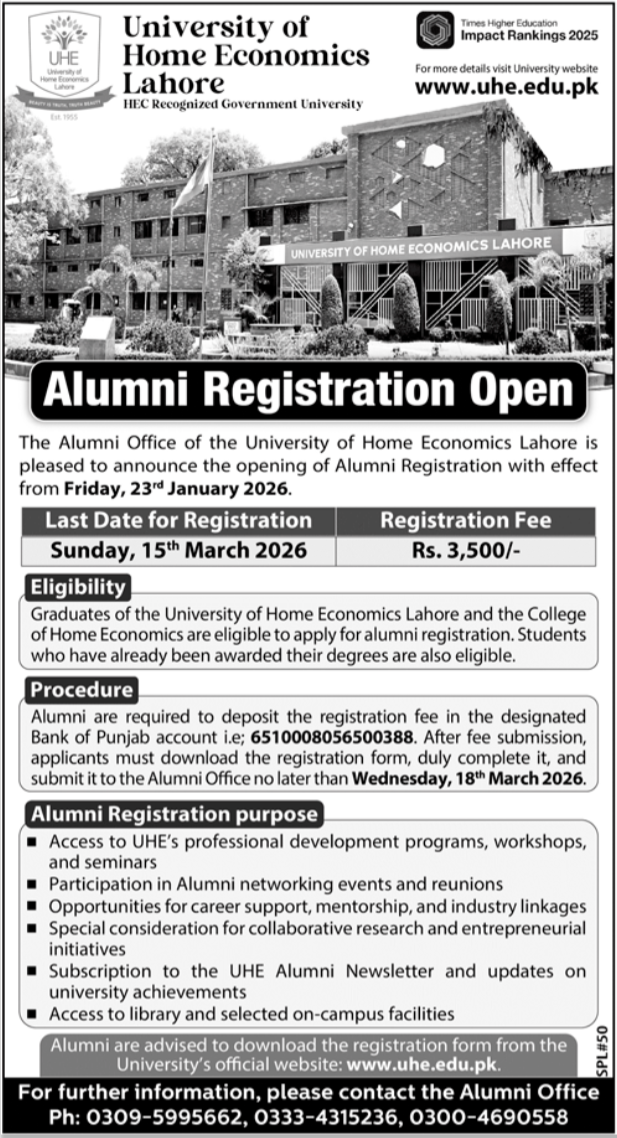 The University of Home Economics Lahore, a premier HEC-recognized government institution, has formally announced the commencement of its Alumni Registration process for the year 2026. This initiative aims to strengthen the bond between the university and its graduates, fostering a professional network that supports both personal and institutional growth. Registration is officially open as of Friday, 23rd January 2026.