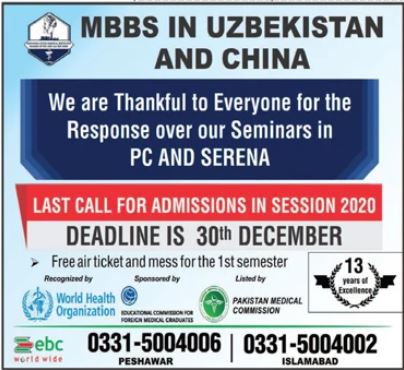 A well known and famous universities of China and Uzbekistan is seeking applications from Pakistani Nationals for admissions 2021 in MBBS Program. Last date to apply is 20th December 2020.