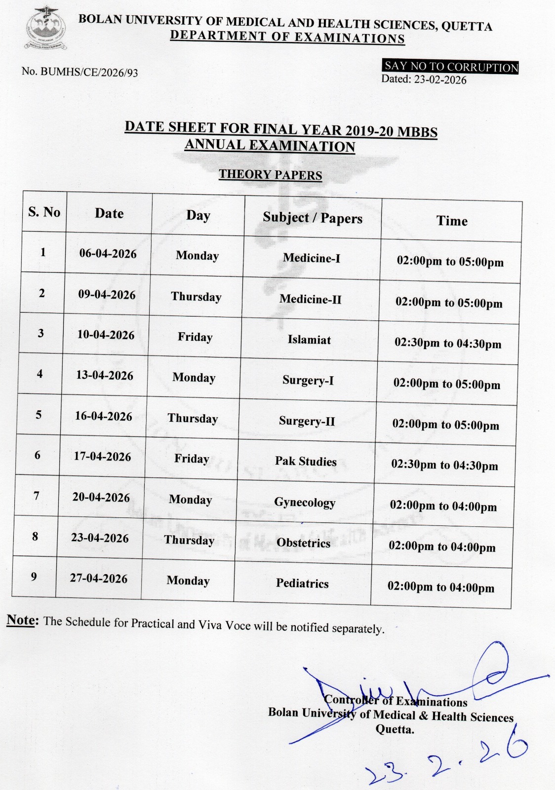MBBS Final Exam 2026 Datesheet Released by BMHS Quetta