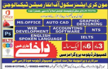 Moon Creations School Of Information Technology Muzaffarabad has been announced admissions for Computer Diploma Courses in MS Office, Auto Cad, Graphic Designing, Web Development, Accounting Software, English Spoken Language, IELTS. Admissions are Open.