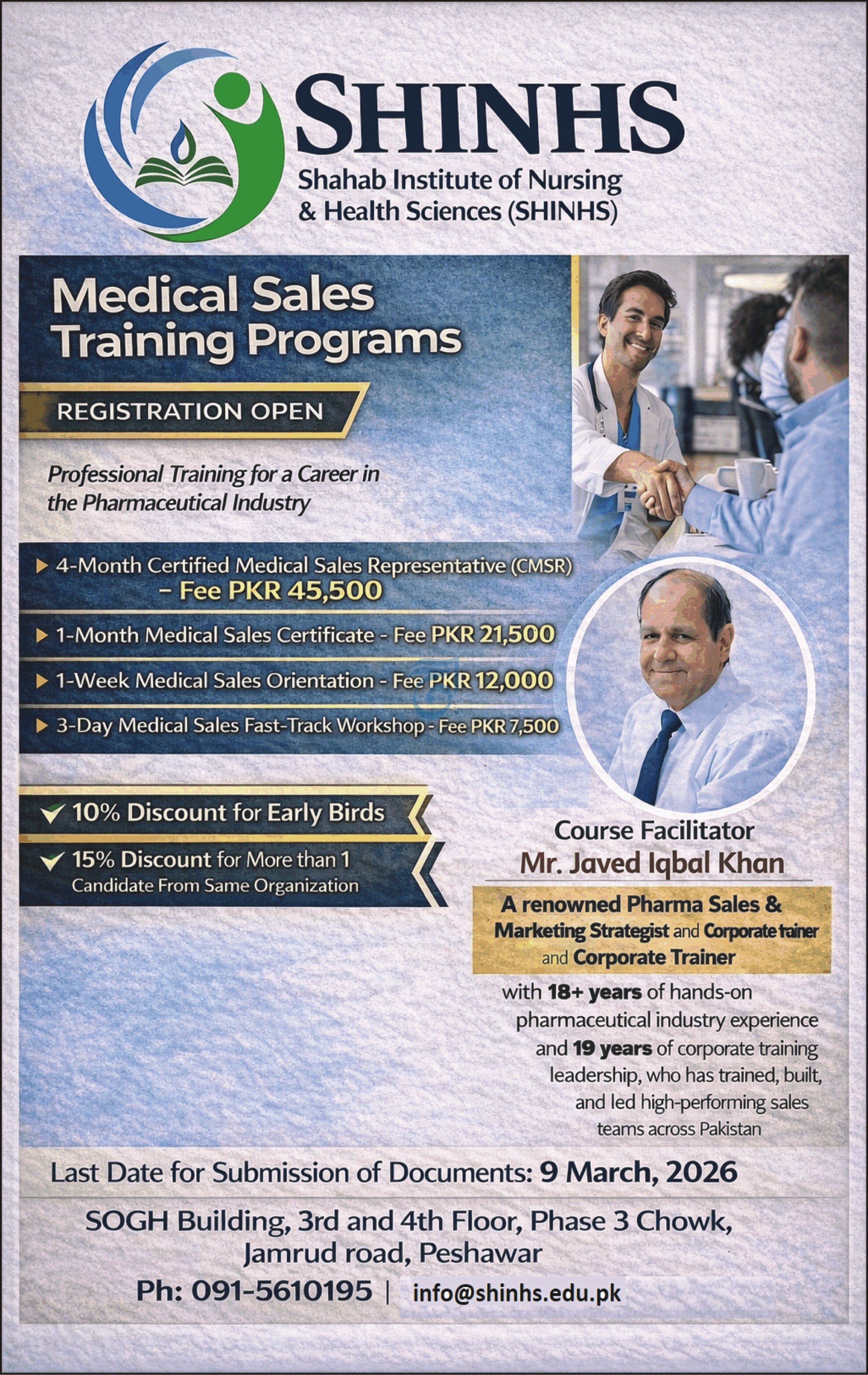 The admissions 2026 cycle at SHINHS focuses on providing "Professional Training for a Career in the Pharmaceutical Industry." These programs are curated to equip candidates with the strategic communication and technical skills required to excel in competitive medical markets. Led by renowned industry veteran Mr. Javed Iqbal Khan—a strategist with over 18 years of pharma experience—the curriculum ensures that [SHINHS] Courses 2026 remain aligned with current corporate leadership standards.