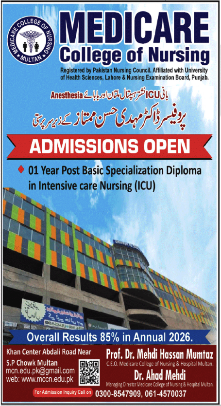 Medicare College of Nursing, registered with the Pakistan Nursing Council and affiliated with the University of Health Sciences Lahore, as well as the Nursing Examination Board, Punjab, is now accepting applications for its Post Basic Specialization Diploma in Intensive Care Nursing ICU for Annual 2026.