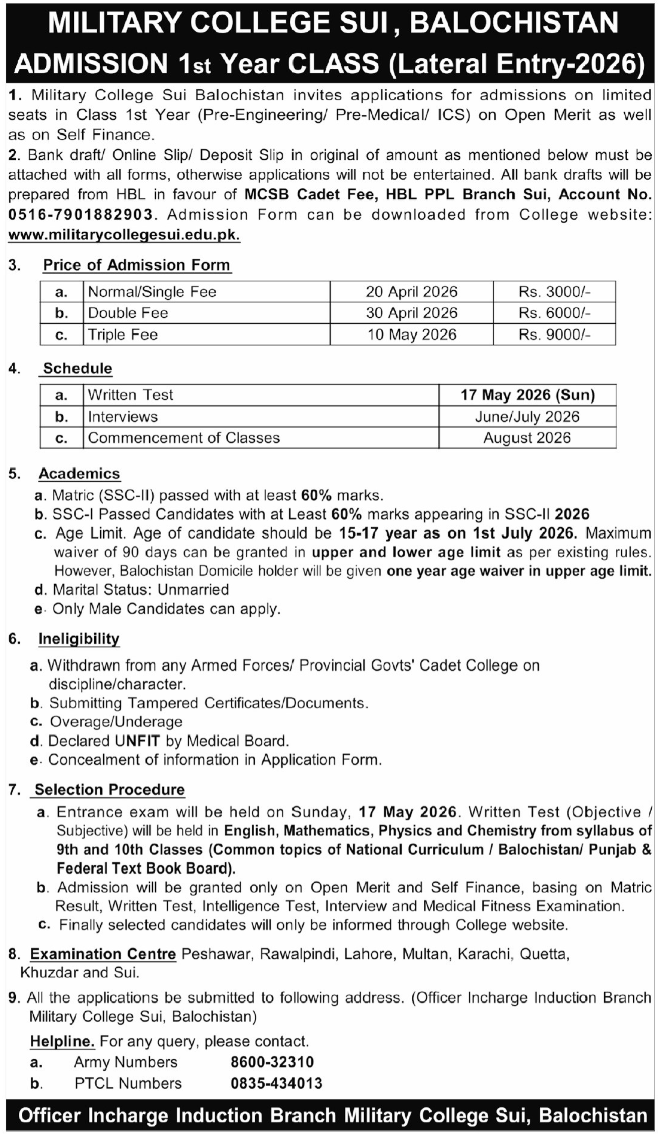 The prestigious Military College Sui MCSB has officially opened applications for limited seats in the 1st Year class for the 2026 session. This lateral entry opportunity is designed for bright, disciplined young men aiming to join a premier institution that blends academic excellence with military character building. Students can now pursue Military College Sui Admissions 2026 in Pre-Engineering, Pre-Medical, and ICS groups.