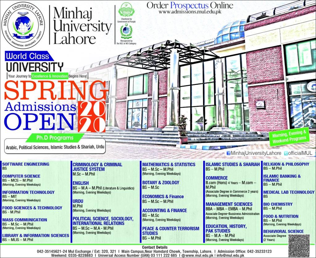 Minhaj University BA BSc BS MSc M.Phil admissions 2019