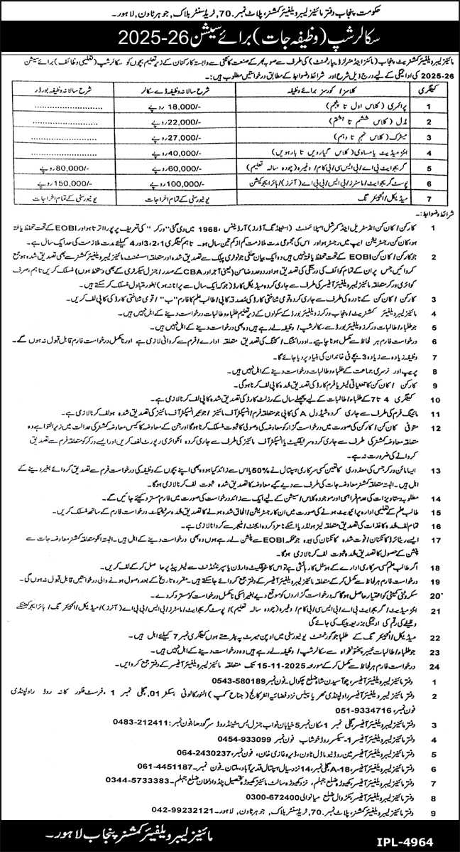 The Mines Labour Welfare Commissionerate Punjab under the Mines & Minerals Department, invites scholarship applications for the academic session 2025-26. The scholarships are intended for the children of mine workers across Punjab and are offered under the following categories, conditions, and stipend rates: