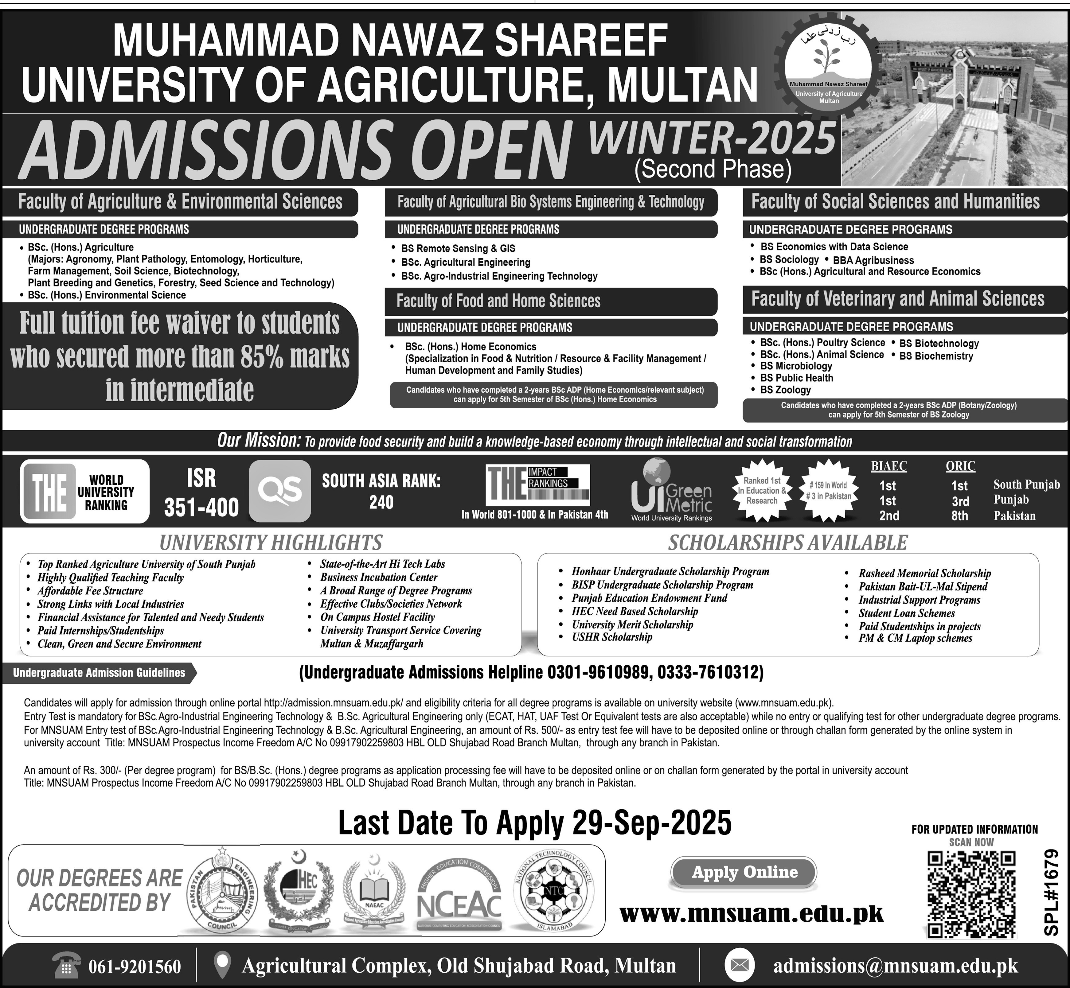 The Muhammad Nawaz Sharif University of Agriculture, Multan MNSUAM invites applications for Undergraduate Admissions – Winter 2025 across a wide range of degree programs in agriculture, food sciences, engineering, veterinary sciences, and humanities. With world-class facilities, highly qualified faculty, and strong industry linkages, MNSUAM is South Punjab’s leading agricultural university committed to food security and intellectual transformation.