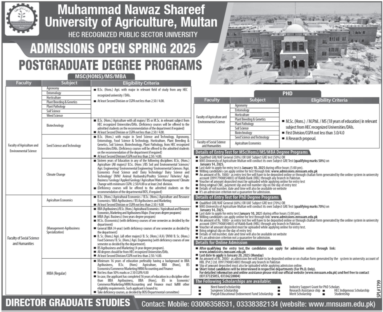 Muhammad Nawaz Shareef University of Agriculture MNSUAM is now accepting applications for postgraduate programs for the Spring 2025 session. The university is offering admissions in MSc Hons, MS, MBA, and PhD programs across various disciplines.