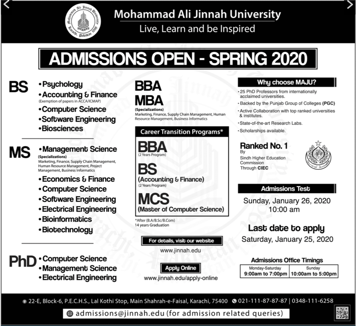 for the session of 2020. The Mohammad Ali Jinnah University Karachi has now starts the Admission