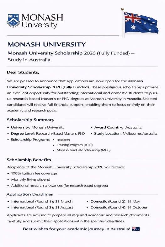 Monash University has officially announced the opening of applications for its prestigious 2026 scholarship program, offering a fully funded opportunity for international and domestic students to pursue research-based Master’s or PhD degrees in Australia. This initiative is designed to support high-achieving scholars by providing comprehensive financial coverage, allowing them to focus exclusively on their academic and research objectives. With multiple application rounds scheduled throughout the year, the Monash University Scholarship 2026 stands as one of the most competitive and sought-after awards for postgraduate research in the Southern Hemisphere.