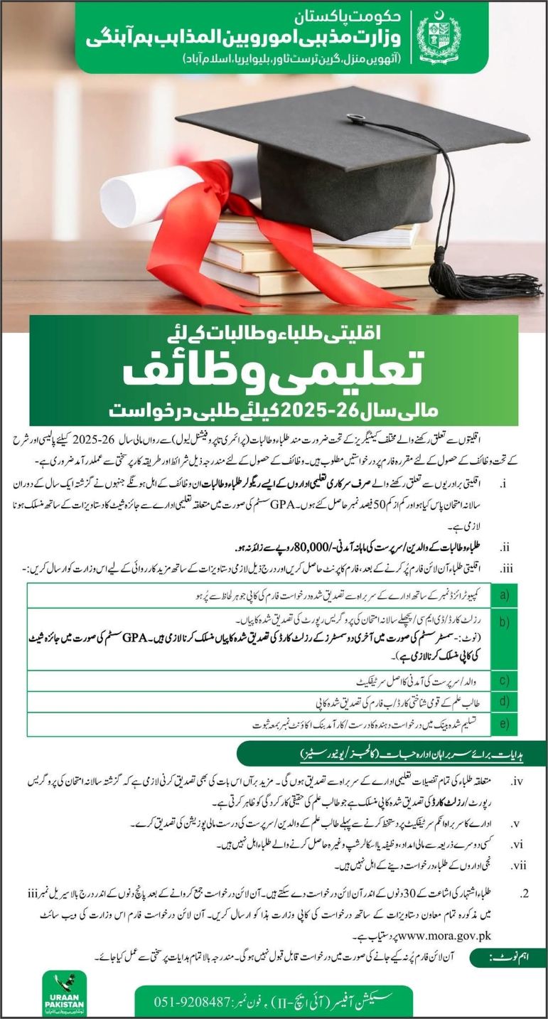 Application forms for the MORA Minority Scholarship 2025-26 are available with this announcement and can also be downloaded from the official website: mora.gov.pk. Students belonging to minority groups, whose parents or guardians earn less than PKR 80,000 per month, are eligible to apply for this scheme.