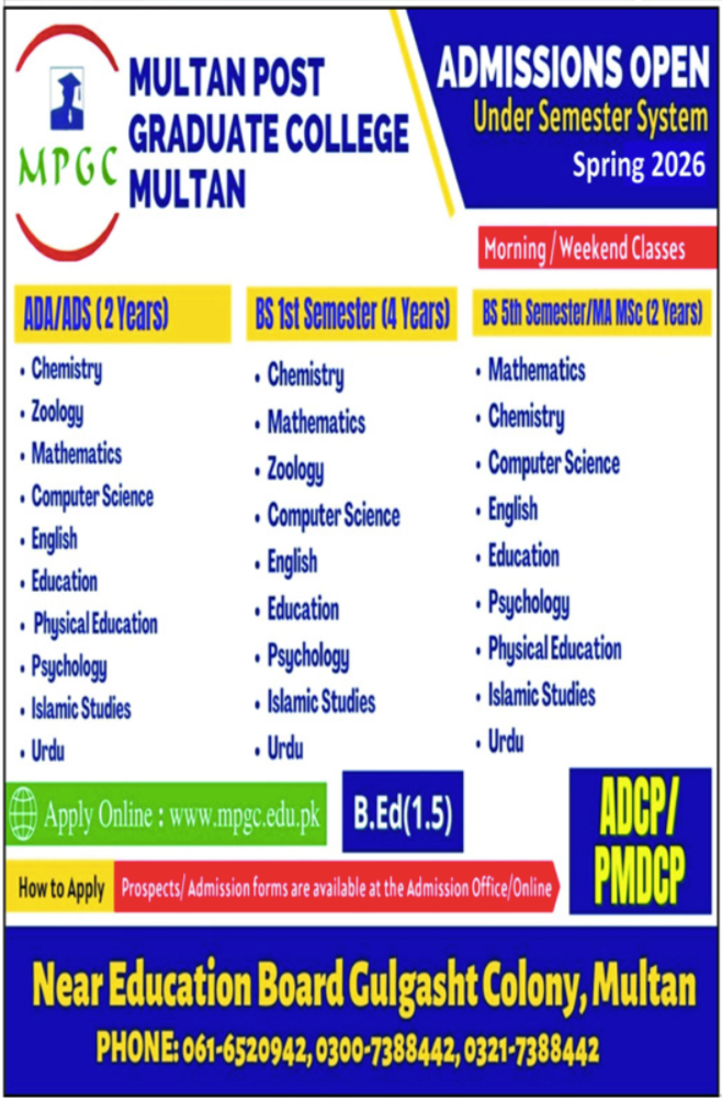 Multan Post Graduate College MPGC is now accepting applications for Spring 2026 under the semester system. The college offers morning and weekend classes to accommodate the schedules of all students.