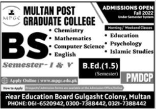 Multan Post Graduate College Admissions 2022 details for said fall semester of 2022 were recently published. Applicants can apply for admission to MPGC one of professional Programs. Among the programs available to students Computer Sciences, English, Psychology, Chemistry, Mathematics, Education and Islamic Studies. Candidates can apply for admission online by visiting their official website. Please apply as soon as possible before the admissions window closes.