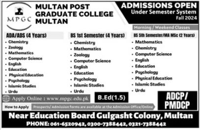 Multan Post Graduate College MPGC is delighted to announce Admissions Open for Fall 2024. Prospective students are invited to apply for a range of programs, including ADA, ADS, BS 1st and 5th Semester, MA, MSC, and BEd. These programs cater to diverse academic interests and career aspirations, providing students with a comprehensive educational experience.