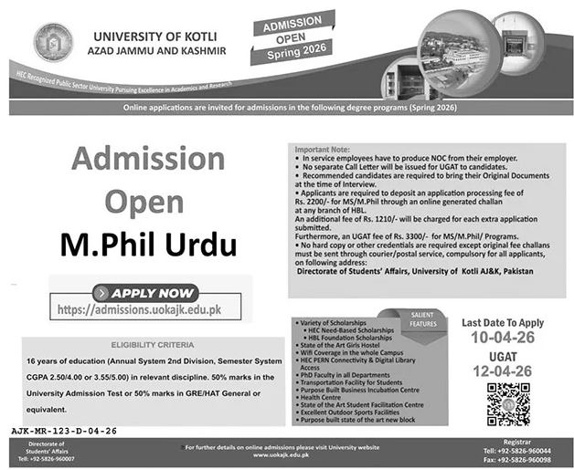 Mphil Urdu Admissions 2026 open at The University of Kotli