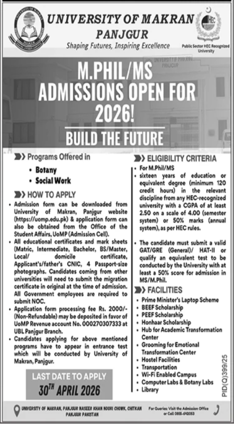 The University of Makran Panjgur has officially invited applications for its advanced degree programs, marking a significant step in enhancing the research landscape of Balochistan. As a public sector HEC-recognized institution, the university is currently accepting students for UoMP Admissions 2026 in specialized postgraduate disciplines. Under the guiding principle of "Shaping Futures, Inspiring Excellence," the university aims to produce scholars equipped to tackle contemporary social and scientific challenges.