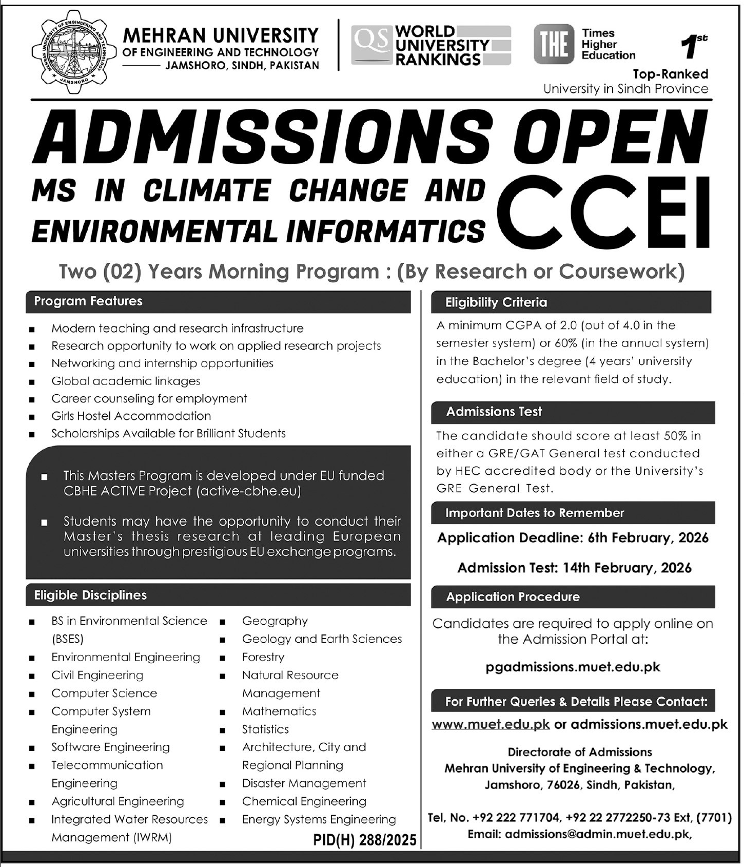 The CCEI program at MUET is designed to provide students with modern teaching and research infrastructure. A standout feature of this Masters program is the opportunity for students to conduct thesis research at leading European universities via prestigious EU exchange programs. MUET Admissions 2026 aims to attract high-caliber candidates who wish to benefit from global academic linkages and networking opportunities with industry leaders.