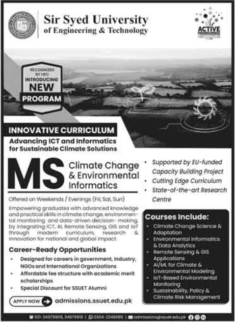 In an era where environmental sustainability is a global priority, Sir Syed University of Engineering & Technology has taken a significant leap by introducing a groundbreaking postgraduate program. The university is now accepting applications for SSUET Admissions 2026, specifically for the newly launched MS Climate Change & Environmental Informatics. This program is uniquely designed to advance ICT and informatics for sustainable climate solutions, addressing the critical need for data-driven environmental decision-making.