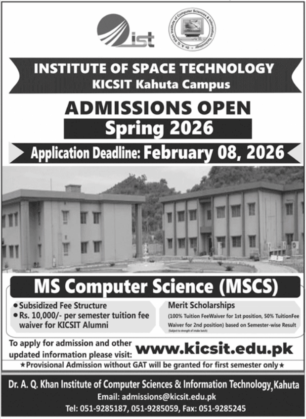 The Institute of Space Technology IST announces Spring 2026 admissions at its Dr. A. Q. Khan Institute of Computer Sciences & Information Technology KICSIT, Kahuta Campus. Applications are invited for the MS in Computer Science MSCS program. KICSIT is a prestigious institute recognized for its academic excellence, research-driven environment, and strong emphasis on advanced computing and information technology education.