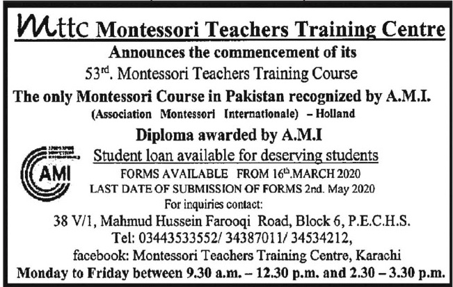 MTTC Montessori Teachers Training Centre Admission 2020 announced for the Diploma Programme. Forms Available from 16th March, 2020. The Last date of Submission of Admission form is 2nd May, 2020.