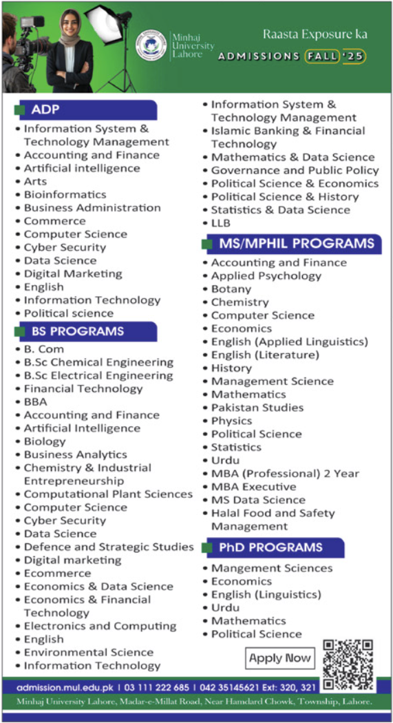 Minhaj University Lahore MUL proudly announces Admissions Open for Fall 2025 in a wide range of programs designed to meet the academic and career aspirations of students in today’s fast-changing world.