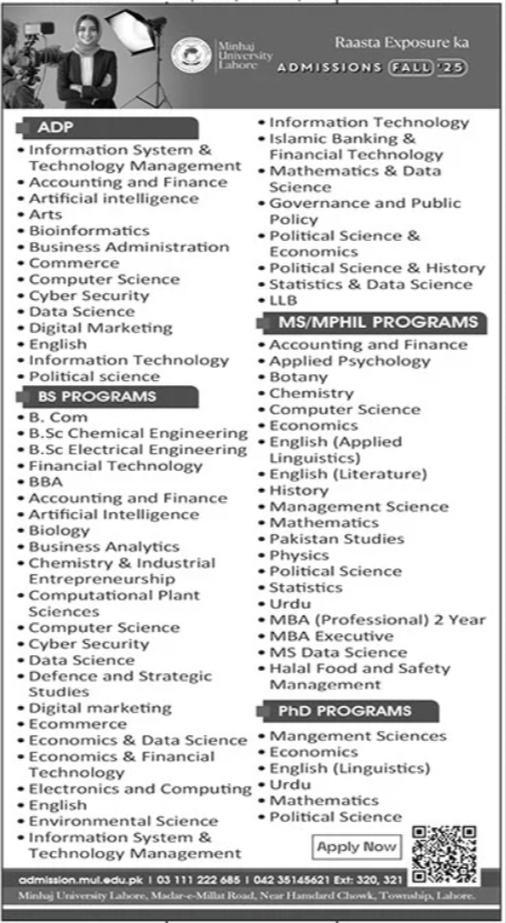 Minhaj University Lahore MUL is now accepting applications for Fall 2025 admissions across a wide range of academic programs. With a commitment to quality education and innovative learning, the university offers diverse undergraduate, graduate, and doctoral degrees designed to prepare students for the evolving professional landscape.