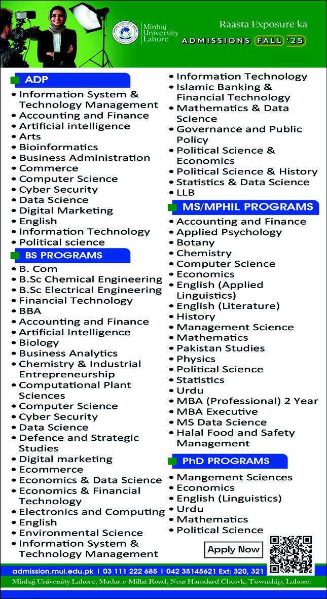 Minhaj University Lahore MUL, a leading institution committed to academic excellence and innovation, is now accepting applications for Fall 2025 admissions. If youre looking to build a strong foundation for a successful career across diverse disciplines, Raasta Exposure ka Minhaj University offers the perfect environment to explore your potential and grow as a leader of tomorrow.