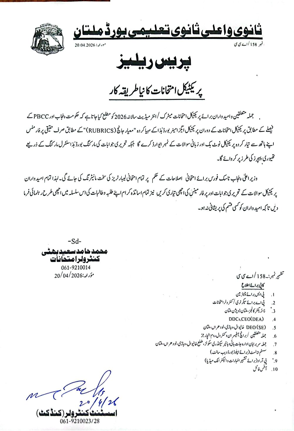The Board of Intermediate and Secondary Education Multan has officially implemented a transformative policy for the BISE Multan SSC HSSC Practical Exams 2026, introducing a rubric-based grading system. This strategic shift, mandated by the Punjab Boards Committee of Chairmen PBCC, moves away from traditional marking toward a transparent, performance-driven criteria. By focusing on genuine student effort and independent work, the board aims to eliminate the culture of "ready-made" assignments, ensuring that every mark awarded reflects a student’s actual skill and understanding in the laboratory.