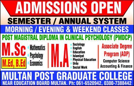 Multan Post Graduate College has announced admissions for MSc, MEd in Mathematics, Economics, Psychology, MA in Social work, Sociology, English, Education, Urdu, Islamyat, Physical education, BEd, ADP.