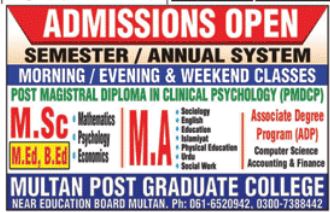 Multan Post Graduate College BEd MA MEd admissions 2019