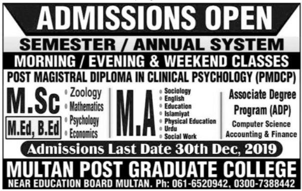 Multan Post Graduate College has offered admissions for MSc, MEd in Mathematics, Economics, Psychology, MA in Social work, Sociology, English, Education, Urdu, Islamyat, Physical education, BEd, ADP. Last date for submission of admission applications is 30 Dec 2019.