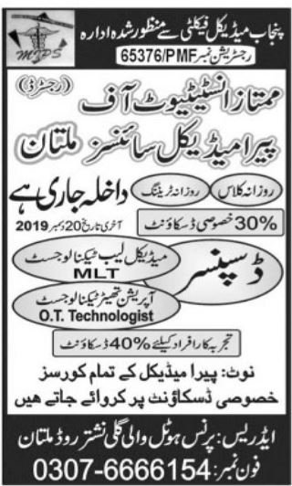 Mumtaz Institute of Paramedical Sciences Multan has offered admissions for Courses in Dispenser, Medical Laboratory Technology, Operation Theater Technologist. Daily Training, Daily Class. Last date for submission of admission applications is 20 Dec 2019.