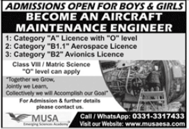 Musa Emerging Science Academy Karachi is seeking for Applications from aspirants for Admission of Aircraft Maintenance Engineering in Category (A) Licence O level, Category (B) 1.1 Aerospace Licence and Category (B2) Avionics Licence for the session of 2021. Admissions are open.