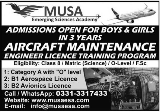 Musa Emerging Science Academy Karachi is looking for Applications from aspirants for Admission of Aircraft Maintenance Engineering training program (3 years) in Category (A) licence O level, Category (B) 1.1 Aerospace licence and Category (B2) Avionics licence for the session of 2021. Male/ Female both are eligible to apply. Admissions are open.