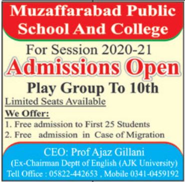Muzaffarabad Public School and College Admission 2020