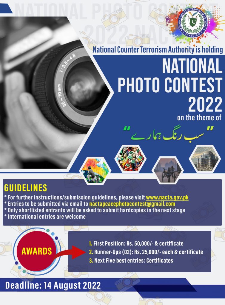 National Counter Terrorism Authority is going to conduct the NACTA National Photo Contest 2022 on the theme of ‘Sub Rang Hamaray’. The candidates, who want to appear in this photo contest, they will follow NACTA National Photo Contest 2022 Schedule and candidates will follow the instructions and guidelines to appear in this contest. The candidates will send their entries by email and only shortlisted candidates will be asked to submit the hard copies by the deadline of 14-08-2022. The candidates will follow the instructions and the winners will be awarded with the prizes. The first prize will be Rs.50,000/- and certificate and there will be two runner ups, who will be awarded with the cash prize of Rs.25,000/- each with certificate and next five best entries will be awarded with the certificates.