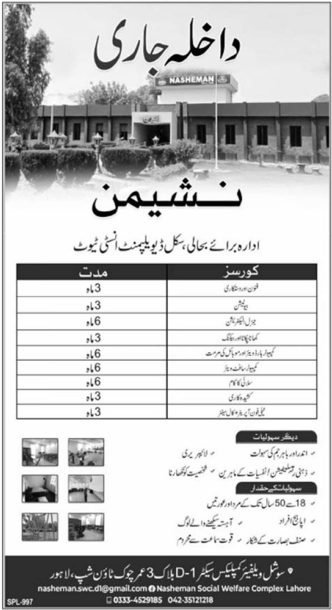 The Nasheman Social Welfare Complex is decided to start the procedure to offer the Nasheman Admissions 2022 and inviting to interested candidates on prescribed Admission Form for granting the Nasheman Social Welfare Complex Admissions 2022 in various courses. Nasheman Courses Admissions 2022 are open in Fun and Industry for 3 months, Beautician for 3 months, General Electrician for 6 months, Cooking and Baking for 3 months, Computer Hardware and Mobile Repairing for 6 months, Computer Software for 6 months, Stitching for 6 months, Telephone Operator and Call Center for 3 months. Candidates may apply, Nasheman Social Welfare Complex Lahore Courses Admissions 2022 are ongoing.