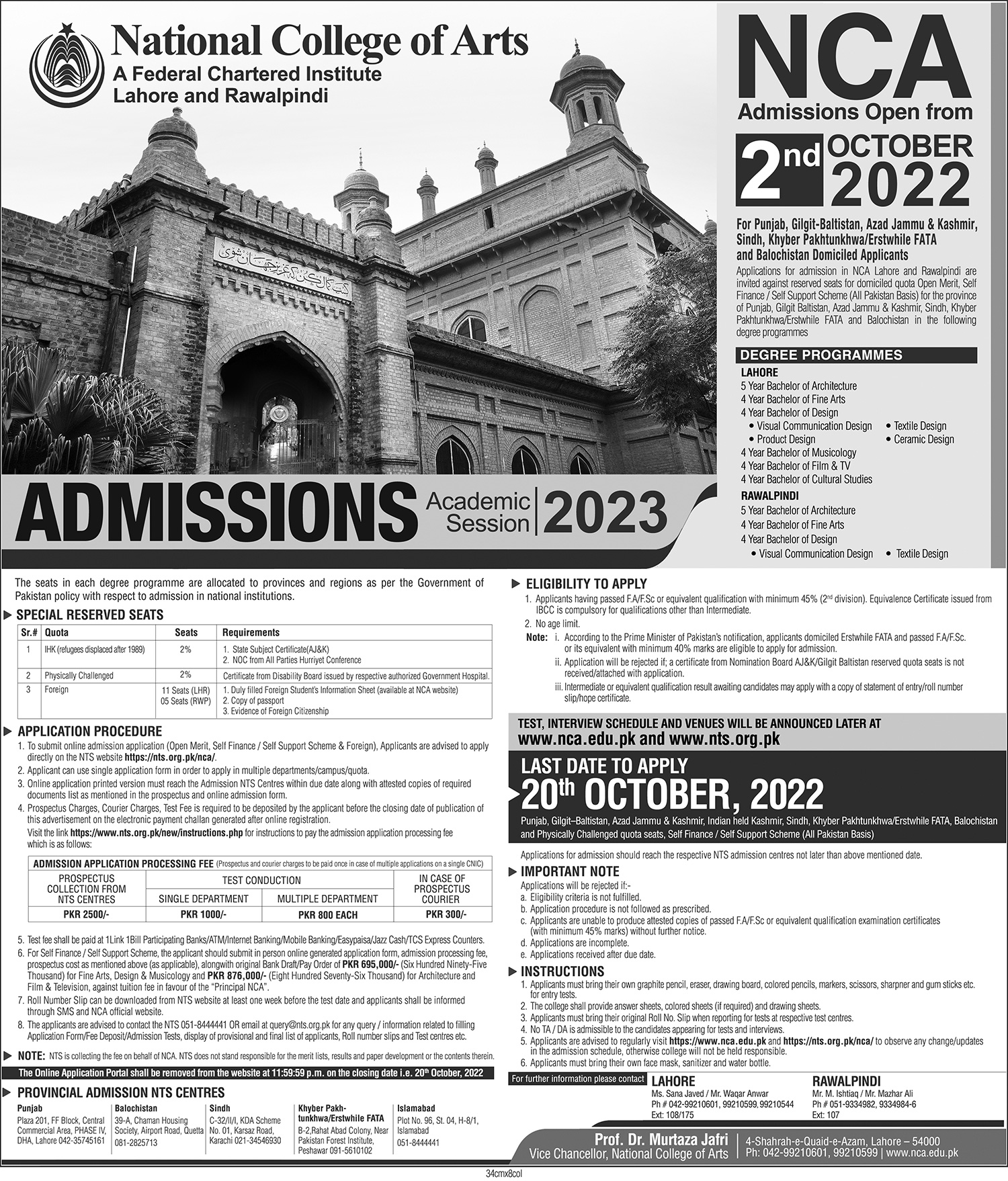 National College of Arts has advertised admission for the year 2023. National College of Arts is offering admission for BS degree program of Fine Arts, Communication Design, Textile design, Product Design, Musicology, Film and TV, Cultural Studies and Bachelor of Architecture. All those student A who want to take admission can visit the appropriate branch or visit University official website for further information as soon as feasible, submit a form before the admission closes. Last date of submission of application is Oct 20, 2022.