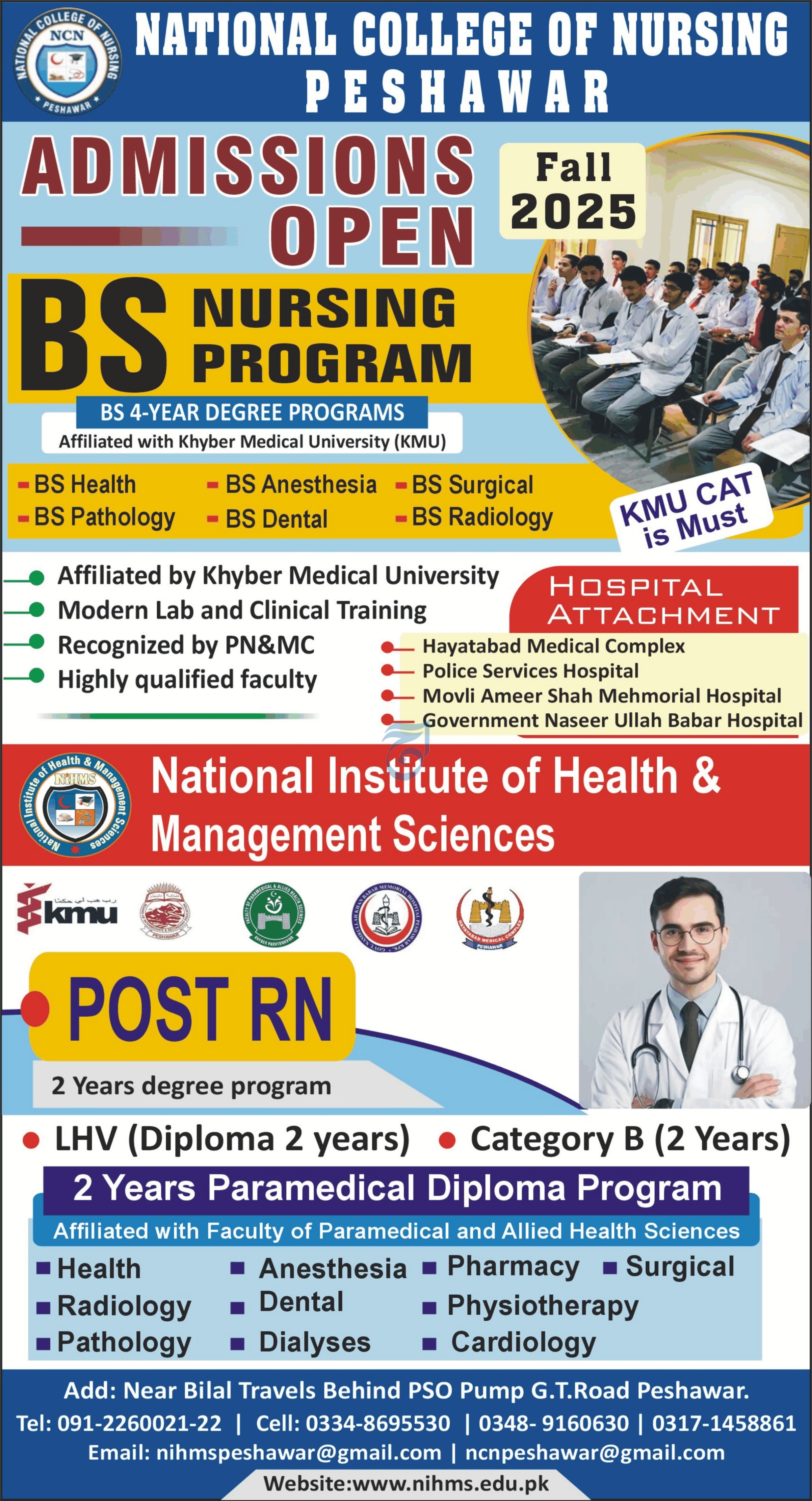 The National College of Nursing NCN, Peshawar, a project of the National Institute of Health & Management Sciences NIHMS, is now accepting applications for its BS Degree Programs, Diplomas, and Post-RN Programs for Fall 2025.