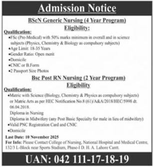 The College of Nursing, National Hospital & Medical Centre, Lahore, is pleased to announce admissions for the 2025 session in the following programs: